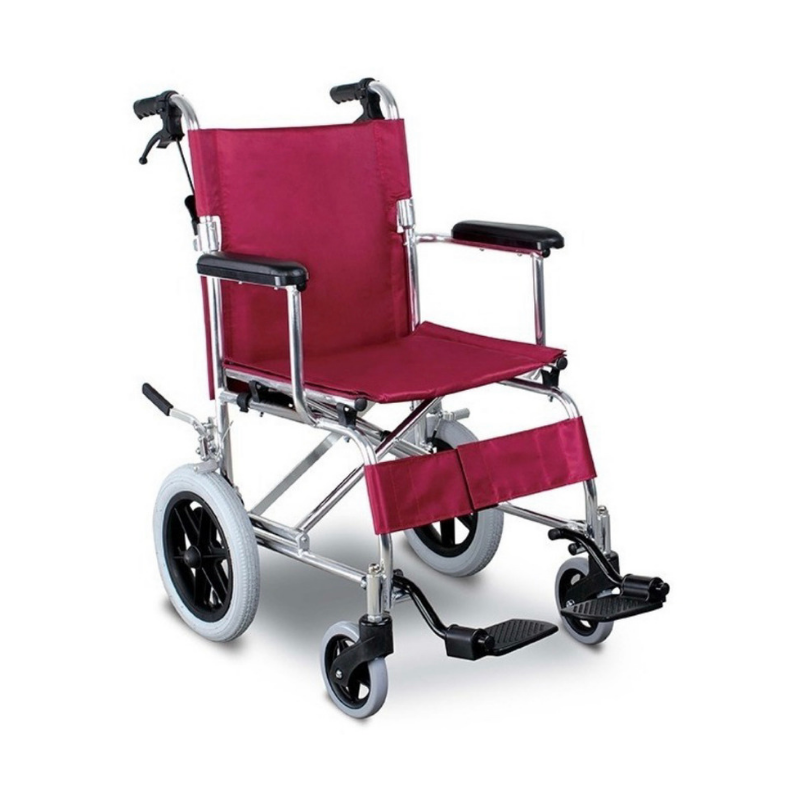 SILLA DE RUEDAS DE TRANSPORTE ALUMINIO DESCANSABRAZOS FIJOS, REPOSAPIES ABATIBLES, RUEDA TRASERA 12 ¨ TEFLON NEUMATICA EN LONA ROJA